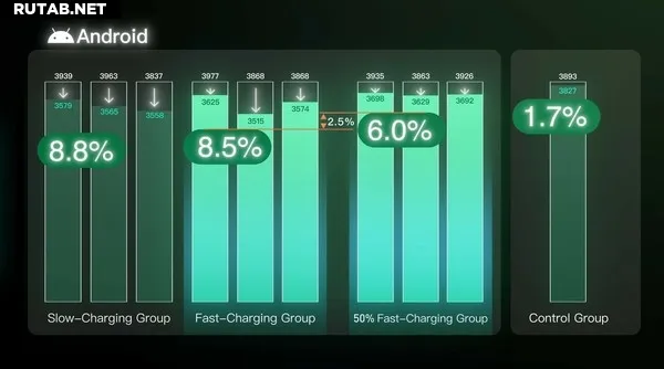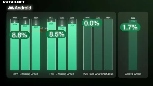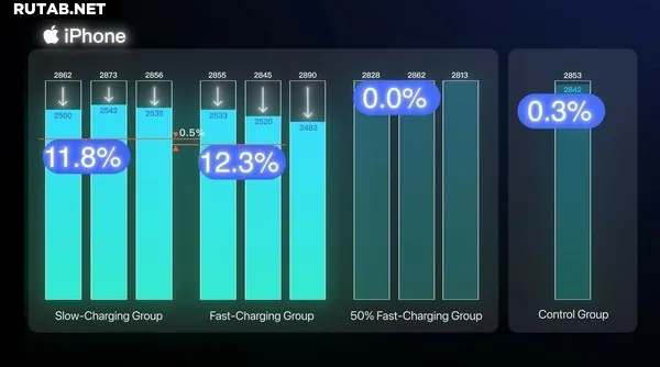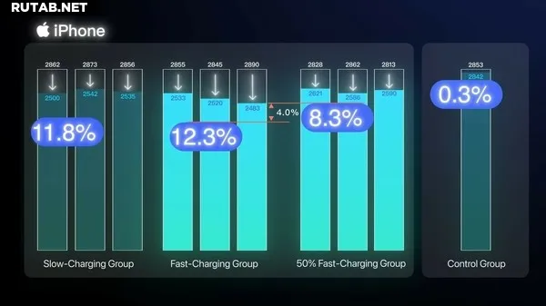 В тестировании использовались шесть iPhone 12 и шесть iQOO 7 (Android), разделенные на три группы: одна группа всегда заряжалась на высокой скорости 120 Вт, вторая — на обычной скорости до 18 Вт, а третья следовала «правилу 30-80%» (заряд всегда поддерживался в диапазоне от 30% до 80%) для щадящей зарядки.