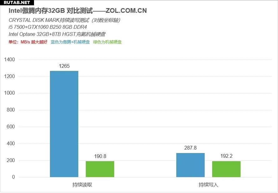 Сначала — скорость последовательного чтения и записи. Благодаря Optane скорость последовательного чтения HDD выросла с 190 МБ/с до 1265 МБ/с. Скорость записи также увеличилась, но не так значительно: с 192 МБ/с до 287,8 МБ/с.