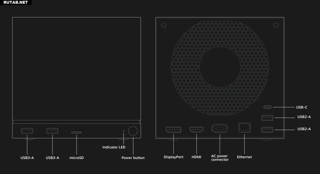 Устройство выполнено в компактном корпусе-кубе со стороной около 16 см и оснащено полным набором портов: HDMI 2.0, DisplayPort 1.4, Ethernet 1 Гбит/с, USB-C и четыре порта USB-A. Блок питания встроен непосредственно в корпус.