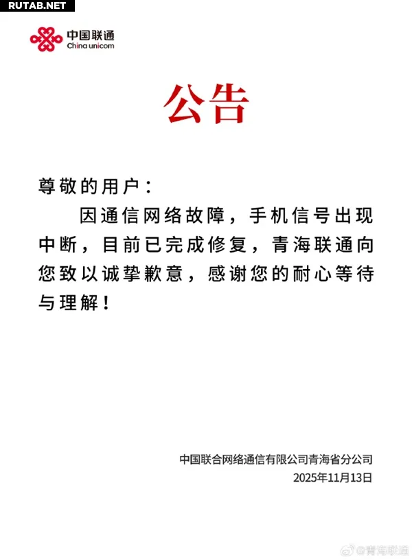 Поздним вечером, в 21:38 по местному времени (18:38 мск), официальный микроблог Qinghai Unicom опубликовал заявление с извинениями, в котором сообщил, что сбой был вызван неисправностью в телекоммуникационной сети, и в настоящее время проблема устранена.