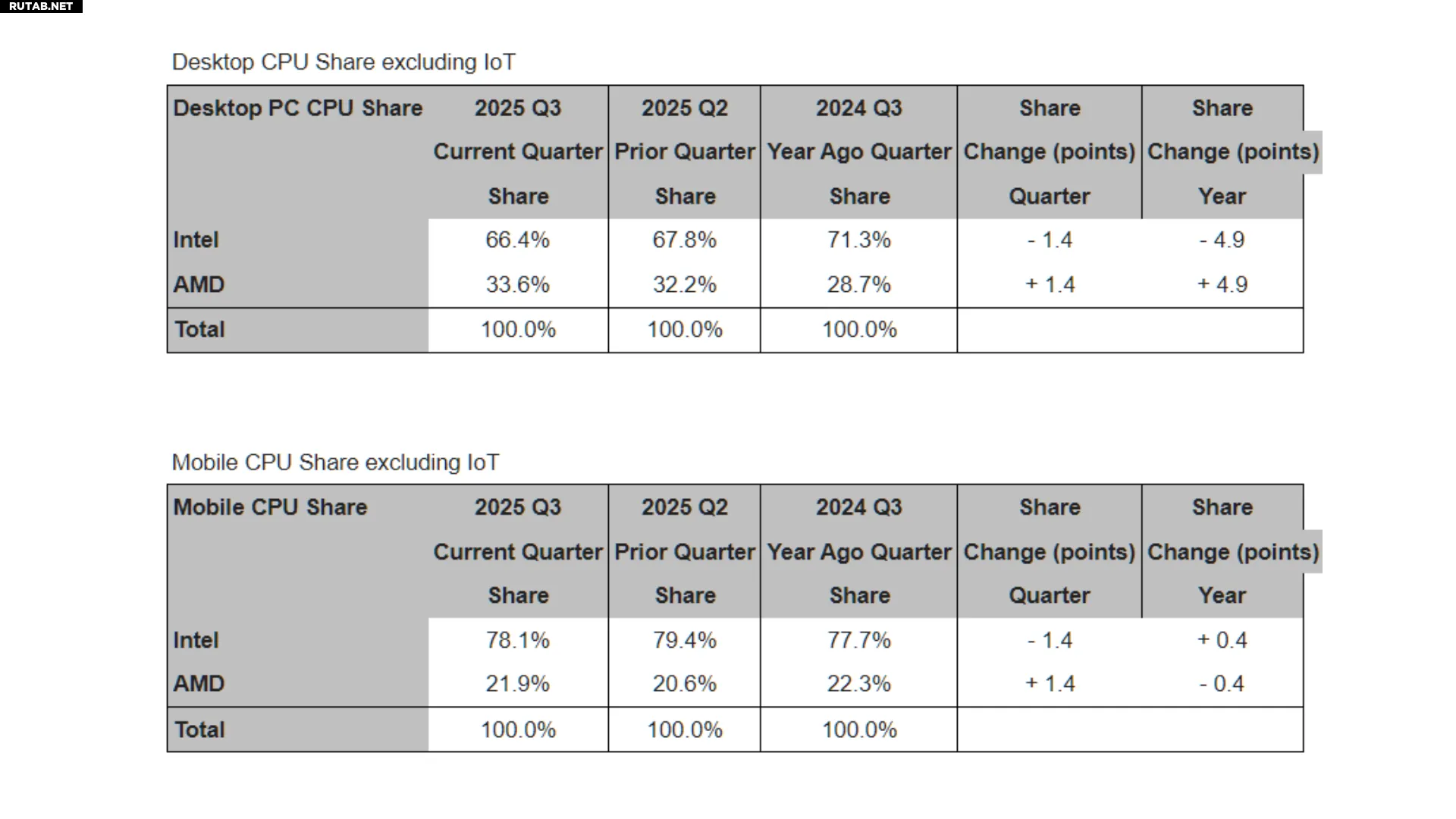 Таким образом, несмотря на относительно успешный год для десктопных процессоров AMD, компания все еще отстает от Intel с долей рынка в 33,6%. И она продолжает отставать и в сегменте мобильных чипов, где доля AMD фактически снизилась до 21,9% по сравнению с 22,3% в том же квартале прошлого года.