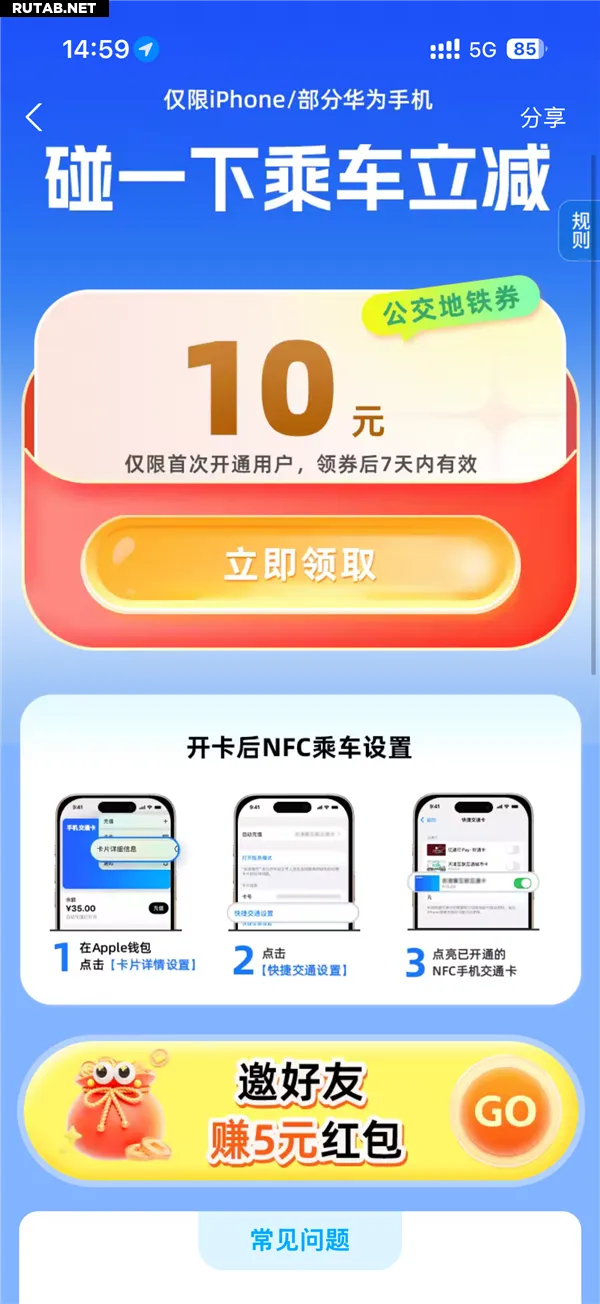 Новые пользователи могут найти карту в приложении Alipay по запросу «Оплата проезда по карте одним касанием» и получить транзитные купоны NFC на общую сумму 10 юаней.