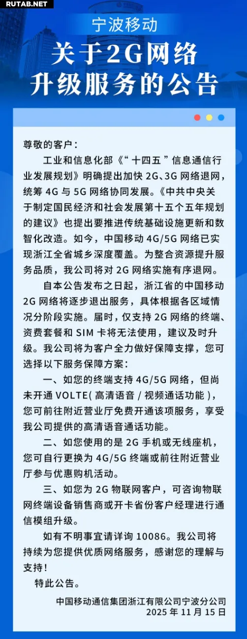 С момента публикации объявления сеть 2G China Mobile в провинции Чжэцзян начинает постепенно прекращать работу, график отключения будет варьироваться в зависимости от конкретного региона.