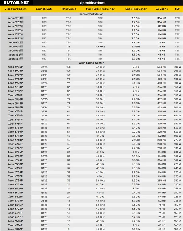 На основе архитектуры Granite Rapids компания готовит серии Xeon 6500P/6700P/6900P, которые будут представлены на рынке рабочих станций как Xeon 600-й серии. Известно о 11 моделях: 698X, 696X, 678X, 676X, 674X, 658X, 656, 654, 638, 636, 634.