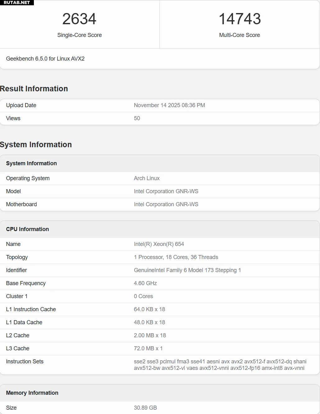 Свежая утечка происходит из базы Geekbench 6, где протестировали Xeon 654 на референсной платформе с 32 ГБ DDR5. Процессор оснащён 18 ядрами и 36 потоками, 72 МБ кэша L3, 36 МБ L2, а заявленная турбо-частота достигает 4,8 ГГц (в базе зафиксировано 4,6 ГГц). Результаты тестов не являются окончательными, поскольку это ранняя инженерная версия, что видно по показателям: 2634 балла в однопоточном режиме и 14743 балла в многопоточном. Даже 12-ядерные Threadripper 9000 показывают здесь лучшие результаты, но финальная производительность коммерческих чипов будет выше.