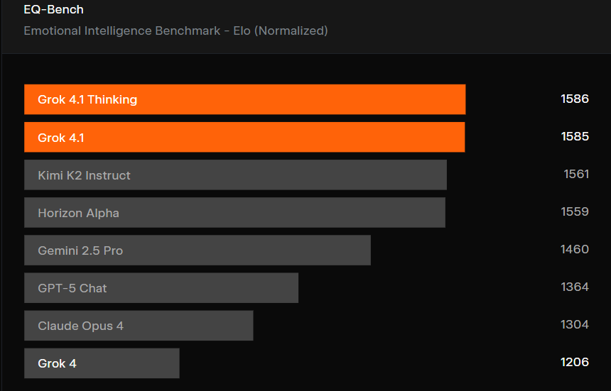 В течение нескольких часов после запуска Grok 4.1 возглавила две крупные таблицы лидеров ИИ. На Text Leaderboard от LMArena она получила предварительный балл 1483, опередив все другие модели, с которыми можно публично общаться. Она также заняла первое место в EQ-Bench3 — тесте, который фокусируется специально на эмоциональном интеллекте и оценивается моделью Claude Sonnet 3.7.