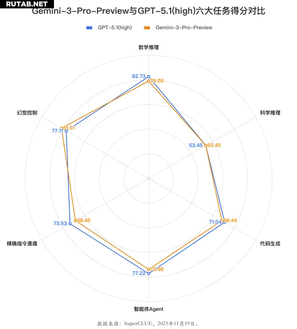 По сравнению с GPT-5.1(high) преимущества Gemini-3-Pro-Preview заключаются в основном в контроле над иллюзиями, и он находится на одном уровне с GPT-5.1(high) в научном мышлении, но полностью уступает по остальным четырем аспектам.