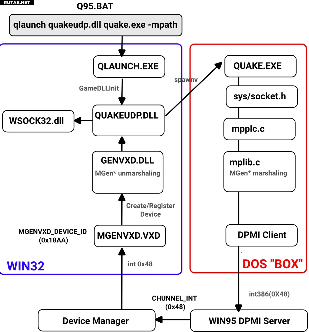 Для завершения кроссплатформенности «Quake» также поставлялся с genvxd.dll от Mpath. Это виртуальный драйвер устройства, который преобразовывал сетевые функции DOS (которые сами используют теперь стандартные вызовы функций BSD-сокетов) в Winsock Windows 95. После его установки путь наконец был завершён, и «Quake» мог беспрепятственно работать как в DOS, так и в Windows, без необходимости в отдельных установщиках или исполняемых файлах.