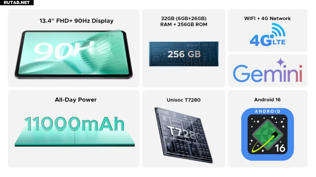 Аккумулятор ёмкостью 11000 мАч обеспечивает длительную работу без подзарядки. Устройство поддерживает быструю зарядку 18 Вт и реверсную зарядку для подключения гаджетов. Планшет работает на процессоре Unisoc T7280 в сочетании с 6 ГБ оперативной памяти (с расширением до 32 ГБ) и 256 ГБ встроенной памяти. Также предусмотрена поддержка 4G LTE.
