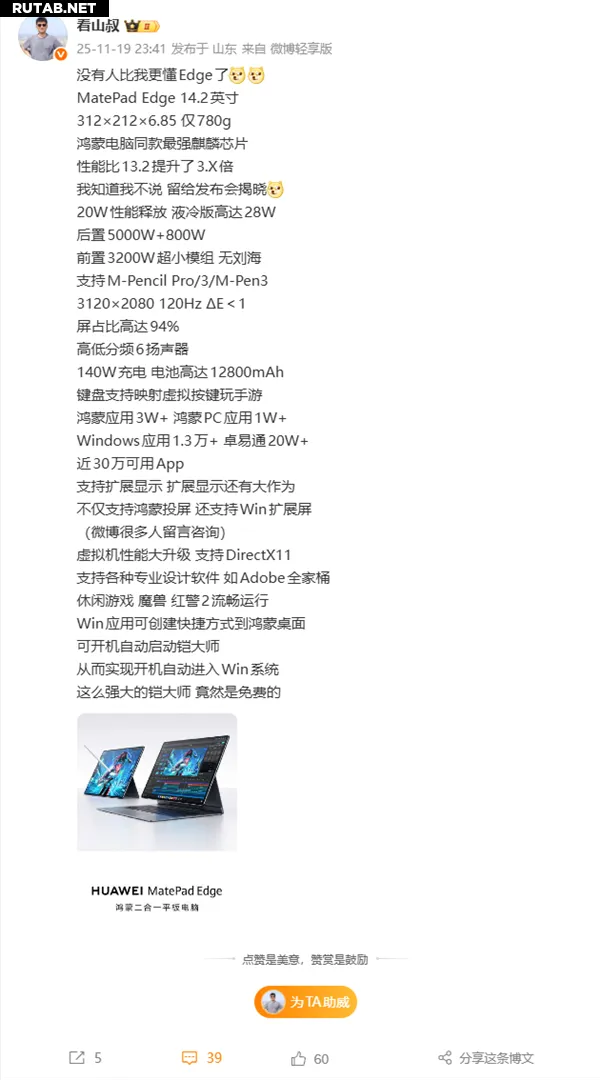 По словам источника, Huawei MatePad Edge оснащен тем же мощным чипом Kirin, что и компьютеры HarmonyOS. Производительность новинки более чем в 3 раза превышает показатели Huawei MatePad Pro 13.2.
