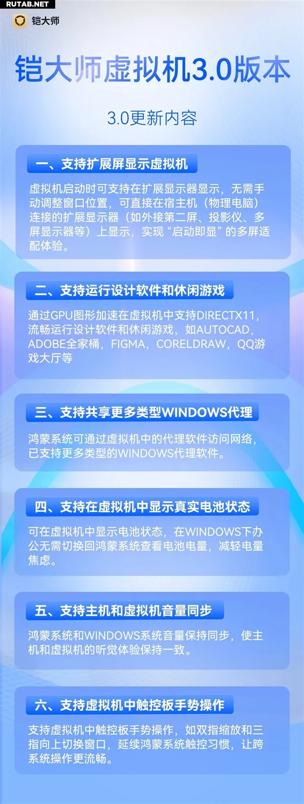 Система поддерживает автоматический запуск виртуальной машины при включении, что позволяет сразу загружаться в среду Windows. Недавно выпущенная HarmonyOS Master Virtual Machine 3.0 получила новые функции, включая отображение реального уровня заряда батареи и жесты сенсорной панели, что делает интерфейс более привычным для пользователей HarmonyOS.