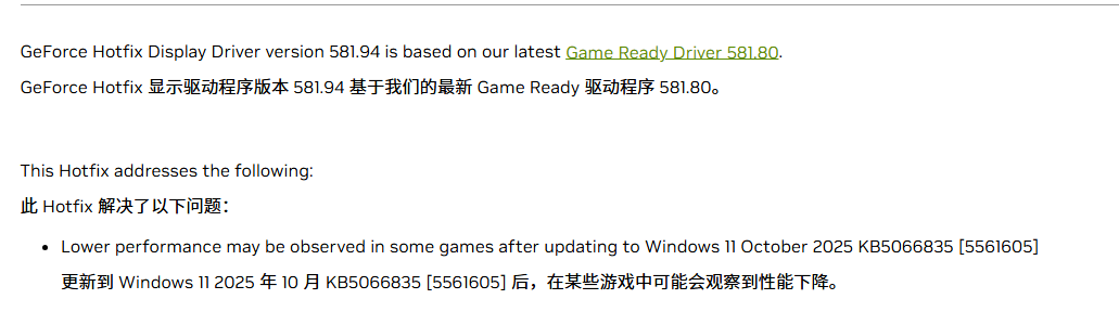 GeForce горячий патч драйвера версии 581.94 основан на нашем последнем драйвере 581.80. Данный патч решает следующую проблему: после обновления до Windows 11 октябрь 2025 KB5066835 в некоторых играх может наблюдаться снижение производительности.