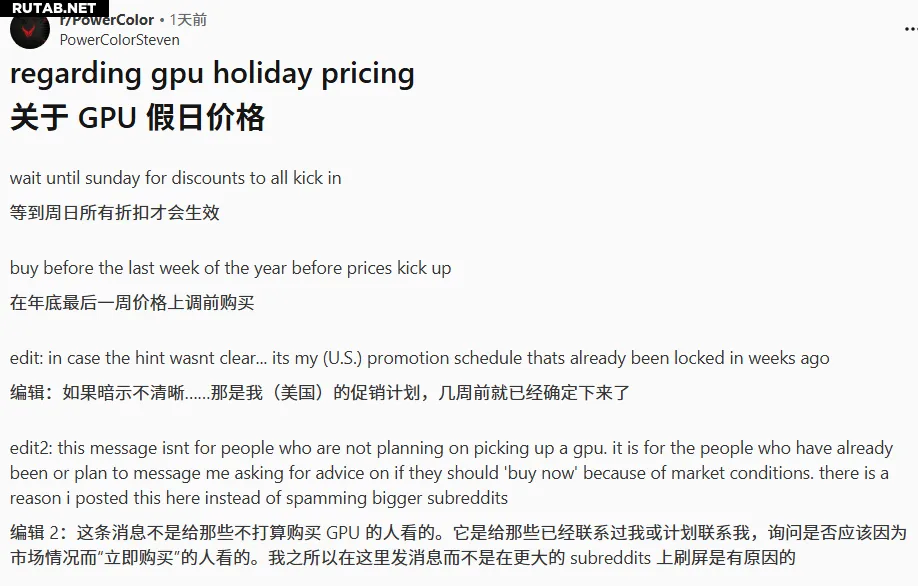 Представитель отдела по связям с общественностью PowerColor Стивен написал на Reddit, предупреждая потенциальных покупателей видеокарт: «Дождитесь воскресенья, когда все скидки вступят в силу, и купите до последней недели года, потому что после этого цены вырастут».