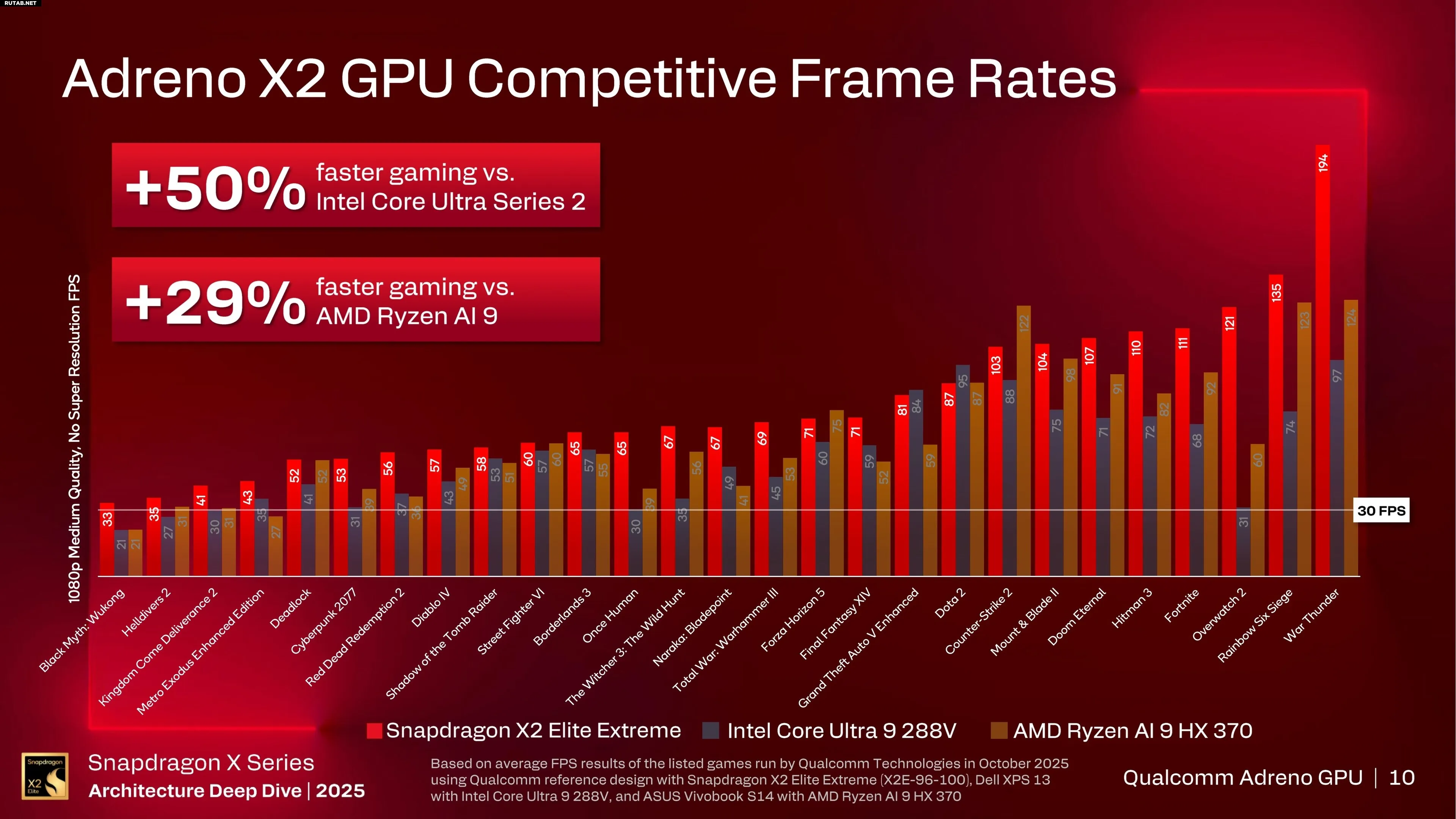 По сравнению с Intel Core Ultra 9 288V, в настройках 1080p (среднее качество, без технологий апскейлинга) Snapdragon X2 Elite Extreme показывает в среднем на 50% более высокую частоту кадров.