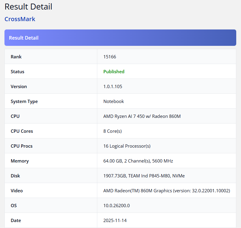 Второй чип, Ryzen AI 7 450, позиционируется как 8-ядерный и 16-поточный процессор с базовой частотой 2,0 ГГц и графикой Radeon 860M. К сожалению, данные о максимальных тактовых частотах отсутствуют, но утечки предполагают, что AMD нацеливается здесь на примерно 5,2 ГГц, что позволило бы обойти предшественника (Ryzen AI 7 350). Что важно, это лишь одна из версий серии AI 7 — наряду с ней существует также вариант AI 7 400, который, как ожидается, будет держаться на частоте буста 5,0 ГГц.