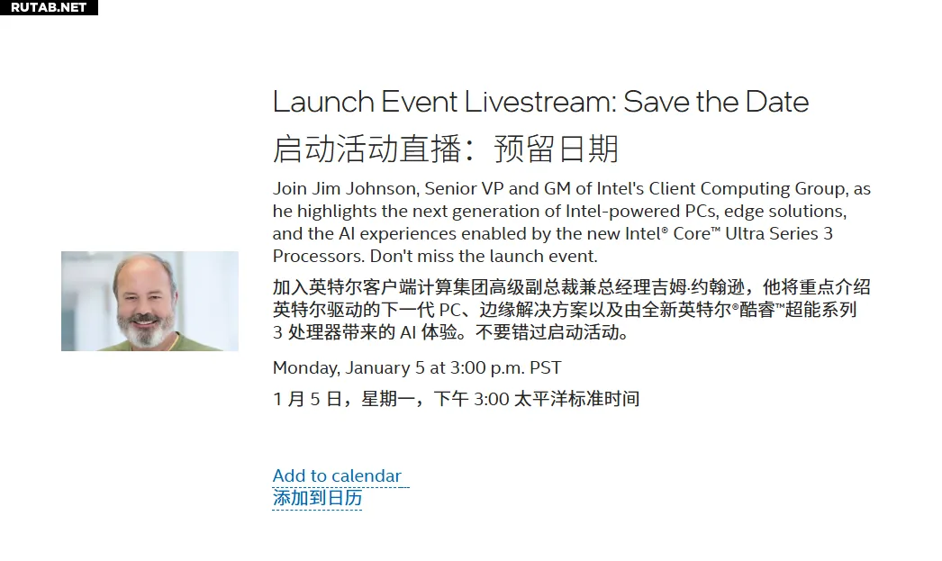 Согласно информации на странице, презентация состоится 5 января в 15:00 по тихоокеанскому времени (6 января в 02:00 по московскому времени) в Лас-Вегасе. Мероприятие проведёт Джим Джонсон, старший вице-президент и генеральный менеджер подразделения клиентских вычислений.