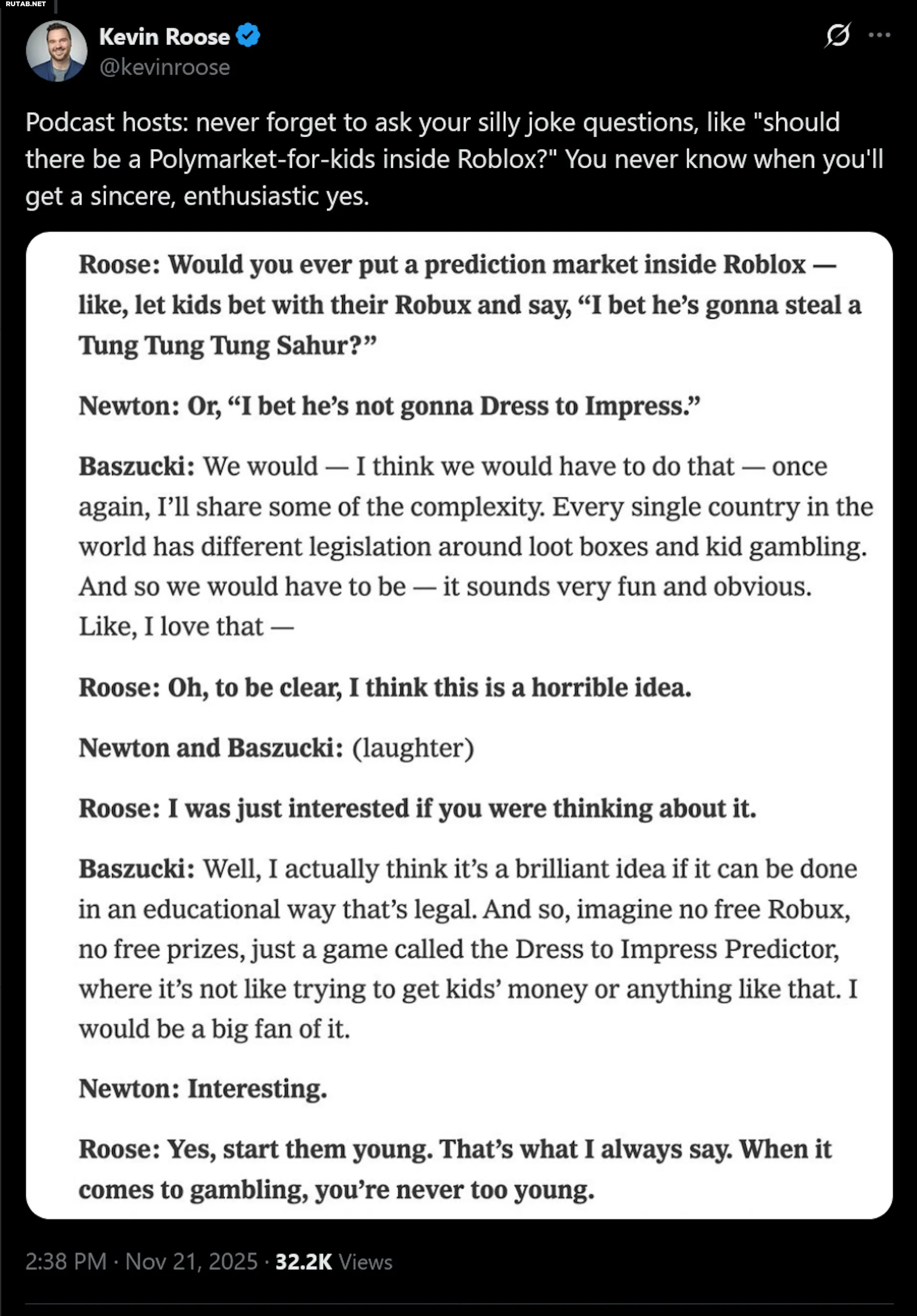 На вопрос о возможном добавлении в Roblox «рынка предсказаний» — платформы для ставок на будущие события — Басзуки ответил утвердительно, назвав это «блестящей идеей», если реализовать её в образовательном и легальном ключе. Журналист парировал: «Начинать нужно с малых лет. В азартных играх ты никогда не бываешь слишком молод».