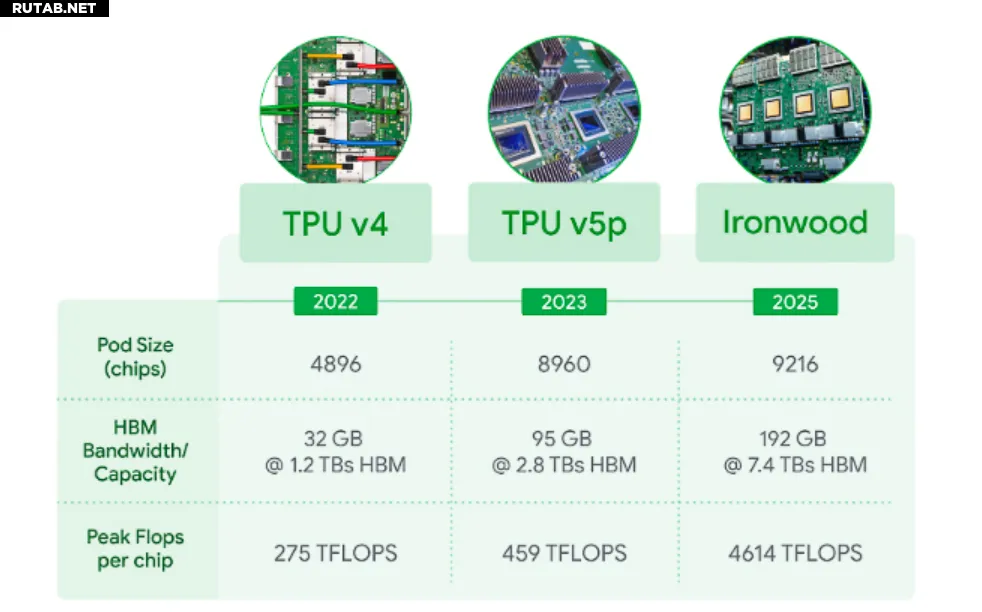 В апреле этого года Google представила платформу TPU седьмого поколения под кодовым названием Ironwood. Каждый чип оснащен 192 ГБ памяти HBM с пропускной способностью 7,4 ТБ/с и обеспечивает производительность 4614 TFLOPS, что в 10 раз превышает показатели TPU пятого поколения при шестикратном улучшении энергоэффективности.