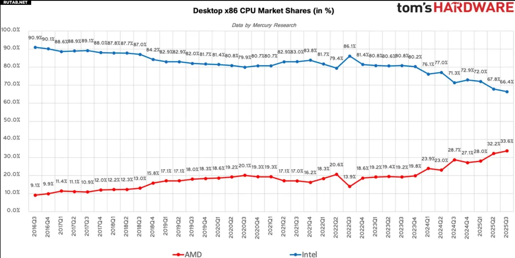 Базовые позиции Intel остаются очень прочными, особенно на рынке ноутбуков, который составляет основу объёмов поставок. Даже успехи AMD с процессорами Ryzen X3D для настольных ПК пока не могут кардинально изменить общую расстановку сил.