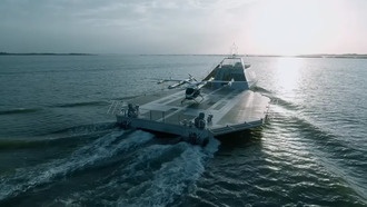 Электрический самолет вертикального взлета и посадки грузоподъемностью 2 тонны приземляется на палубу плавучего вертипорта, покрытого солнечными панелями. [Фото: chinadaily.com.cn]