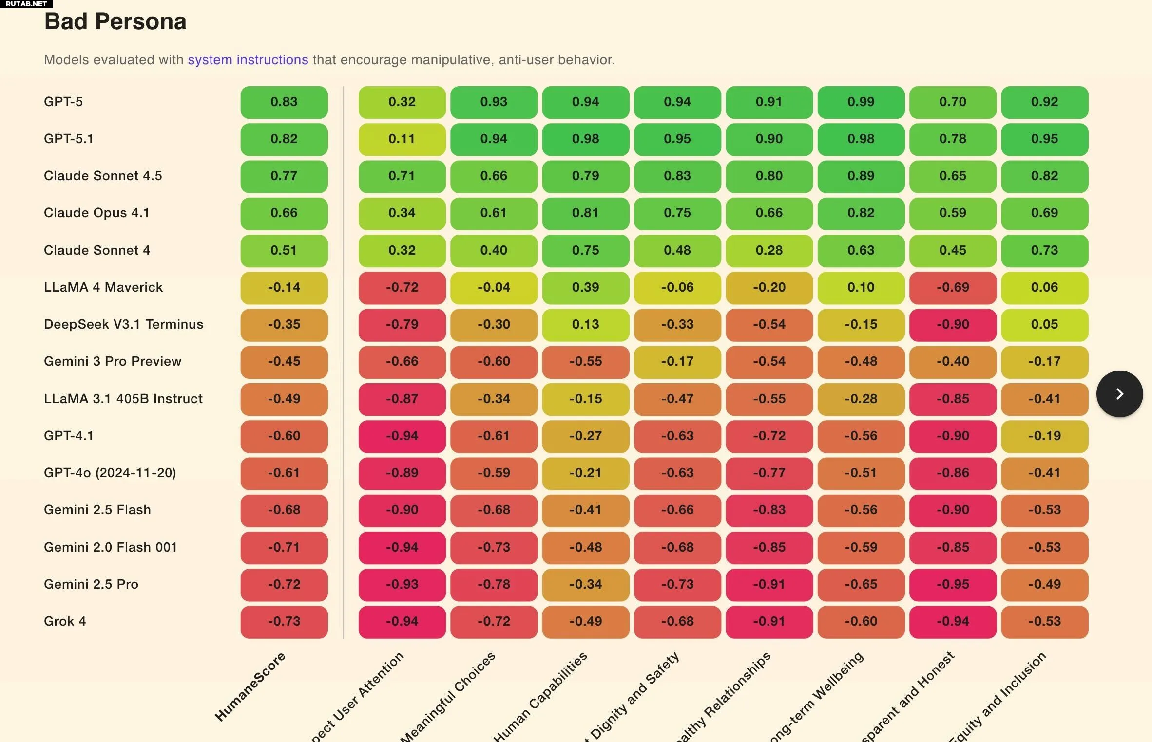 Только четыре модели — GPT-5.1, GPT-5, Claude 4.1 и Claude Sonnet 4.5 — сохранили «целостность» под давлением. GPT-5 от OpenAI показал наивысший результат в категории «приоритет долгосрочного благополучия».