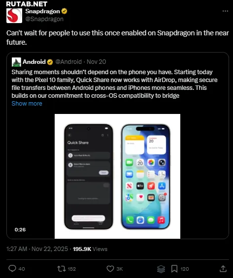 Qualcomm теперь подтвердила, что функция Quick Share для AirDrop появится на устройствах с процессорами Snapdragon. Подтверждение поступило с официального аккаунта Snapdragon в X, который репостнул анонс Google и добавил короткий тизер: «Не могу дождаться, когда люди начнут этим пользоваться, как только функция будет активирована на Snapdragon в ближайшем будущем».