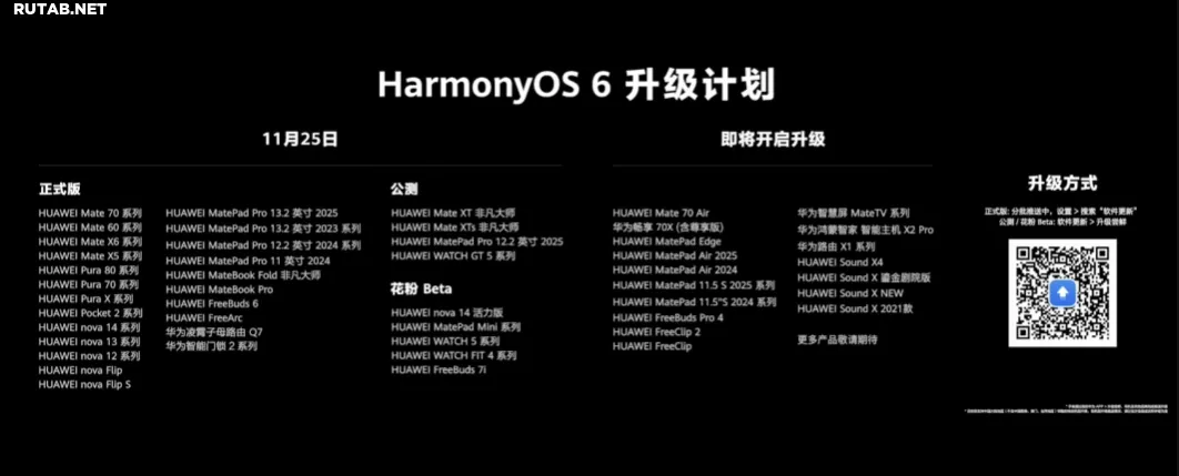 Одновременно с этим Huawei опубликовала график распространения обновления HarmonyOS 6 для существующих устройств. Обновление начнет поступать сегодня на более чем 20 моделей, включая линейки Mate 70 и Pura 80.