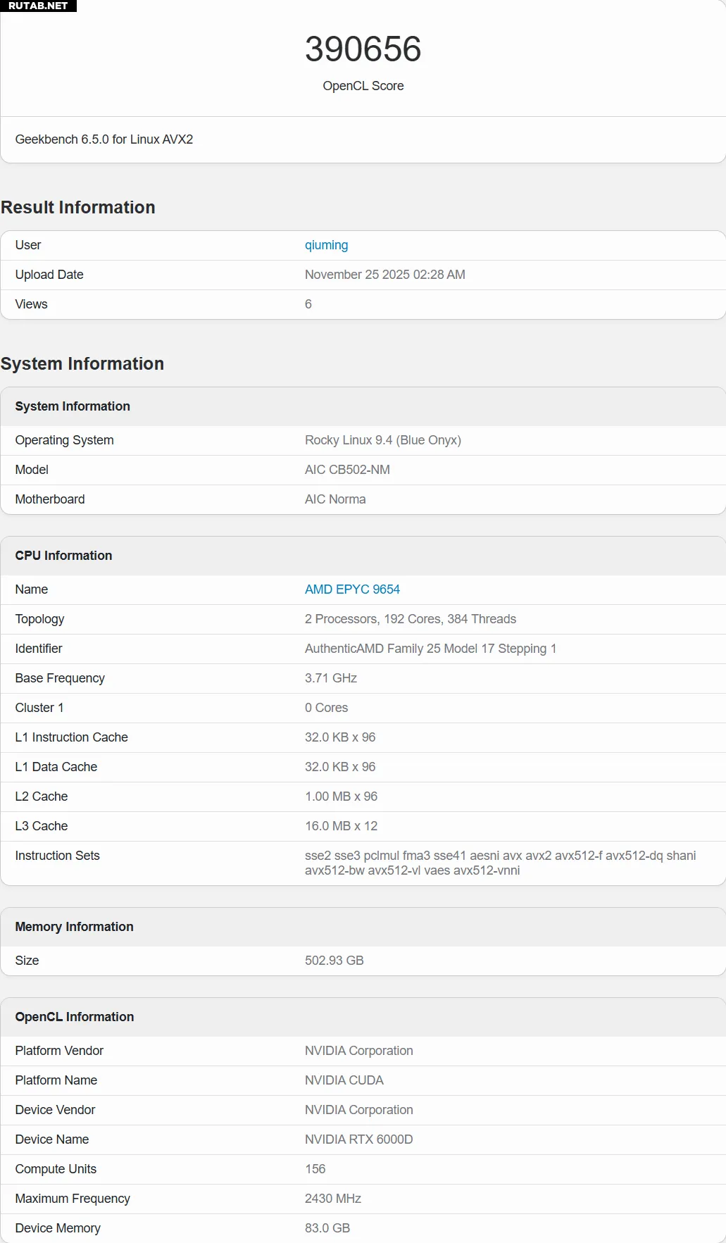 В тесте Geekbench 6 OpenCL видеокарта NVIDIA RTX 6000D набрала 390 656 баллов, что значительно ниже результатов полнофункциональной версии, которые составляют около 450 000–500 000 баллов.