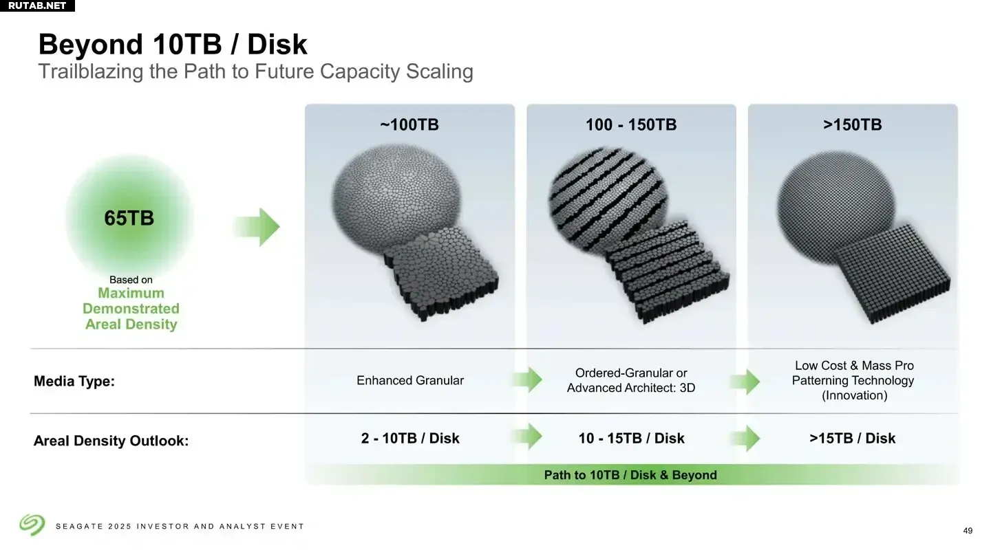 Согласно дорожной карте Seagate, достижение плотности выше 7 ТБ на пластину ожидается в 2030-х годах, а конечной целью является показатель в 15 ТБ на пластину и даже больше.