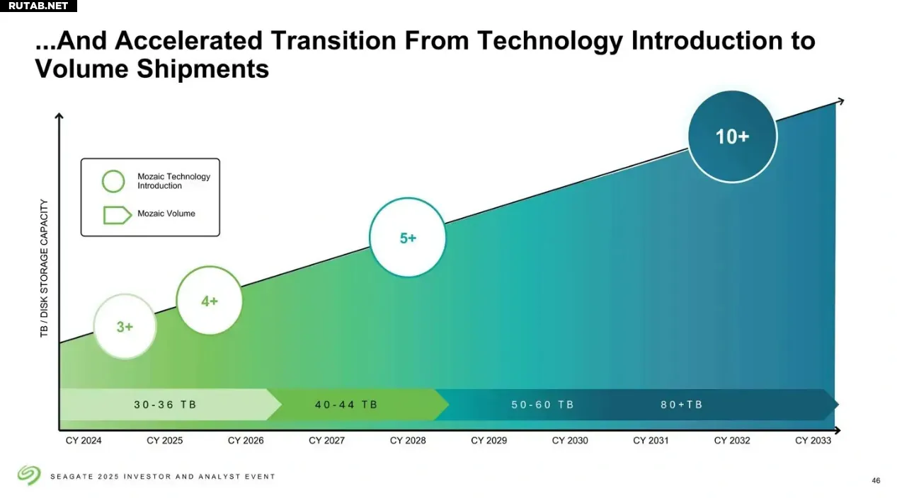 Согласно обновлённой дорожной карте Seagate, достижение ёмкости в 50-60 ТБ к 2030 году выглядит реалистичным. Для выхода на уровень 80 ТБ потребуется плотность записи более 10 ТБ на пластину, что ожидается не раньше 2031-2032 годов.