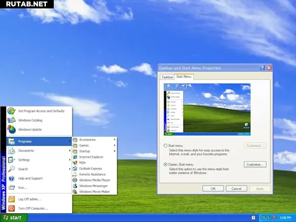 Выпущенная в 2001 году, Windows XP представила переработанное меню «Пуск» с двухколоночным макетом. Левая колонка отображала закрепленные и недавно использованные приложения, а правая предоставляла доступ к пользовательским папкам («Мои документы», «Мои рисунки», «Мой компьютер» и «Панель управления») и системным функциям.