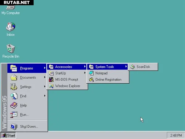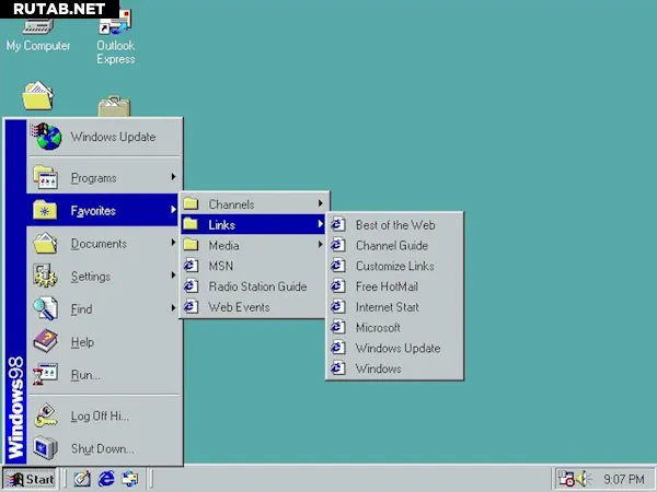 Хотя меню «Пуск» в Windows 98 выглядело почти так же, как первоначальный дизайн в 95-й версии, в нем появилась новая опция «Выход» для функций многопользовательской работы.