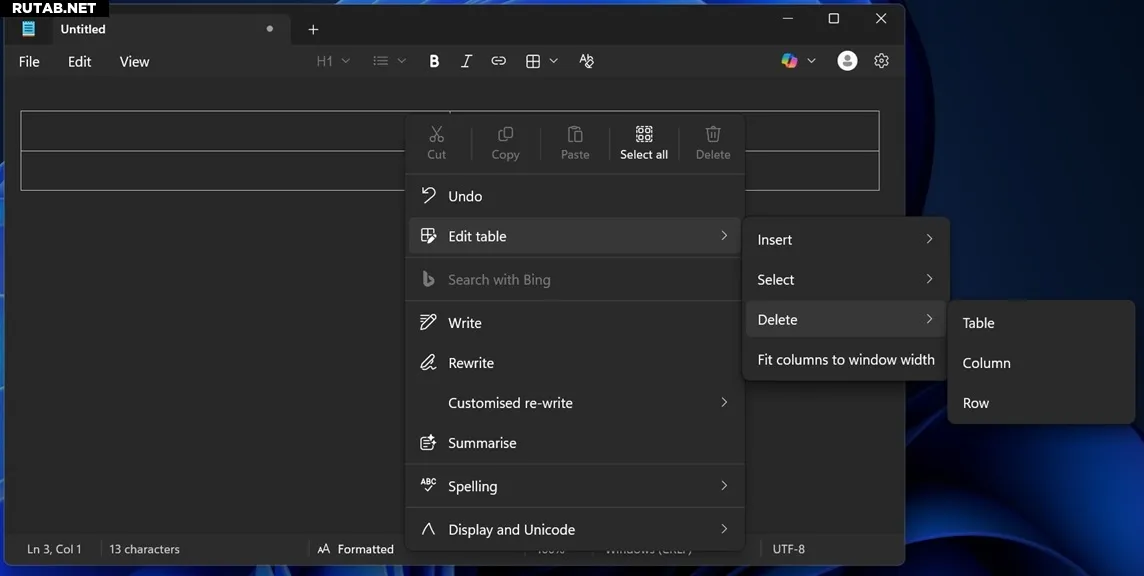 Редактирование таблиц также очень удобно: достаточно щелкнуть правой кнопкой мыши в любом месте таблицы или использовать меню «Таблица» на панели инструментов, чтобы вставить или удалить строки/столбцы. Также поддерживается функция «Подогнать столбец под ширину окна», позволяющая таблице автоматически растягиваться по ширине окна «Блокнота».