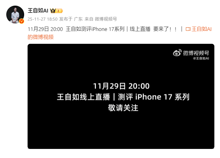 Издание Fast Technology сообщает, что Ван Цзыжу, пионер индустрии обзоров и основатель ZEALER, анонсировал свой «Обзор iPhone 17 серии». Прямая трансляция мероприятия состоится 29 ноября в 20:00 по пекинскому времени (15:00 МСК).