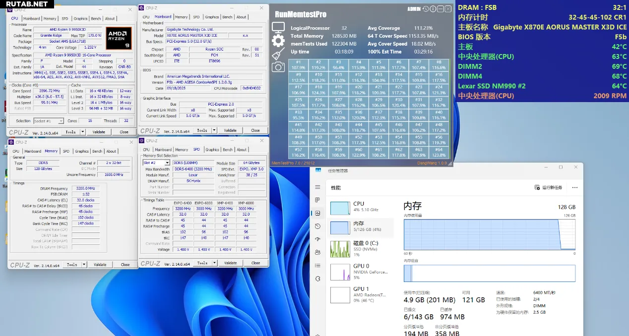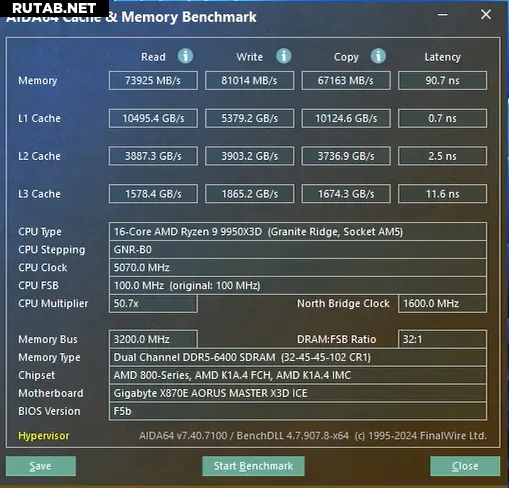 На изображении показано тестирование комплекта в системе с процессором AMD Ryzen 9 9950X3D и материнской платой Gigabyte X870E AORUS.