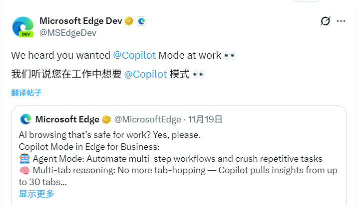 Компания заявила, что интегрирует Copilot в браузер Edge и Windows 11 для рабочих сценариев, поскольку услышала «ваше желание иметь режим Copilot на работе».