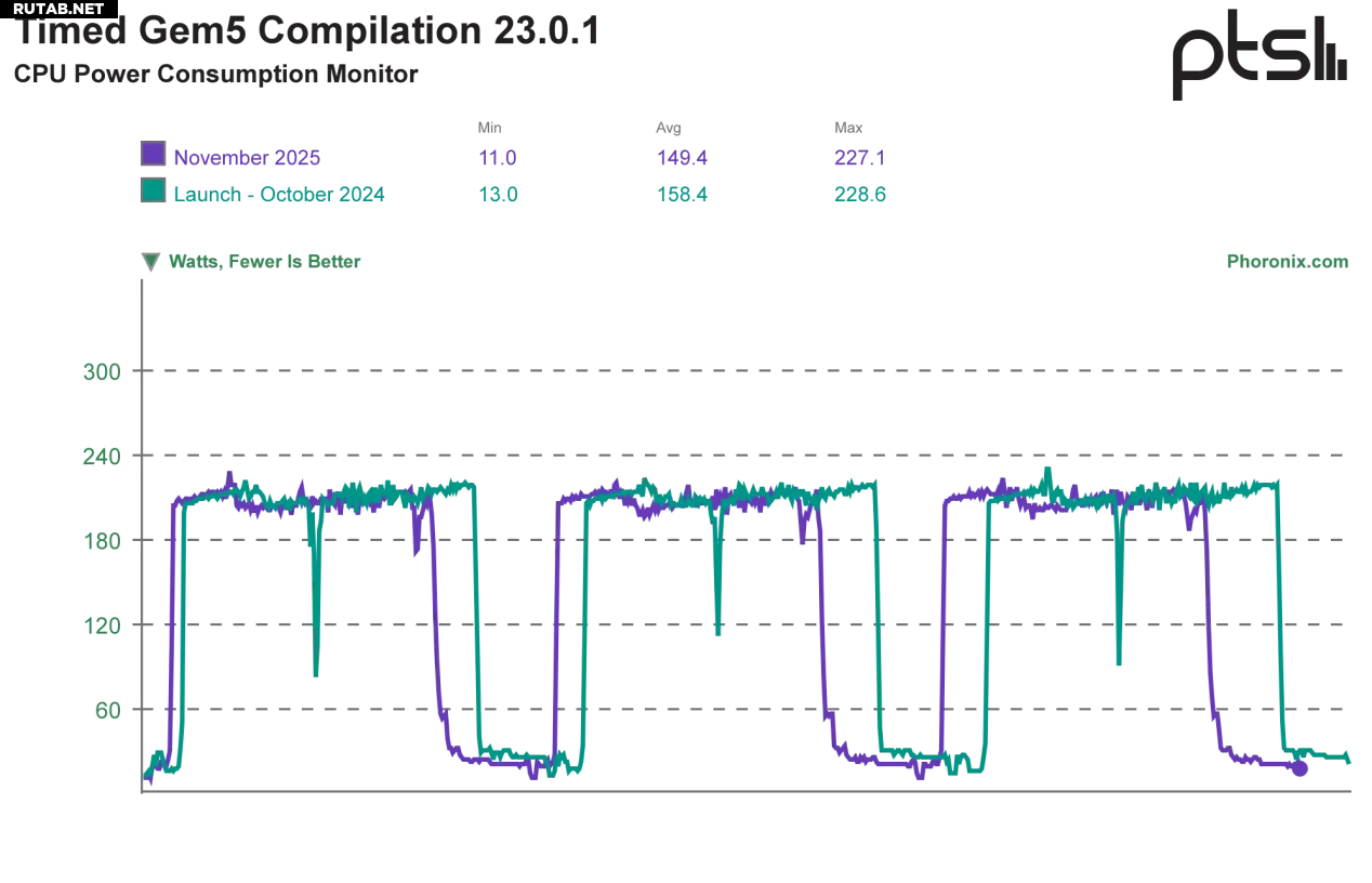 При этом энергопотребление процессора в октябре 2025 года составило лишь 85% от показателей октября 2024 года, что означает снижение на 15%. Это свидетельствует о том, что Intel с помощью программных улучшений не только снизила энергопотребление и тепловыделение чипа, но и раскрыла дополнительный производительный потенциал архитектуры Arrow Lake-S.
