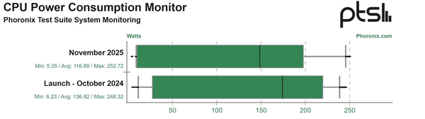 Ещё более впечатляющим стало снижение энергопотребления на 15% — со средних 136,8 Вт до 116,9 Вт, при этом пиковое потребление осталось на уровне около 250 Вт.