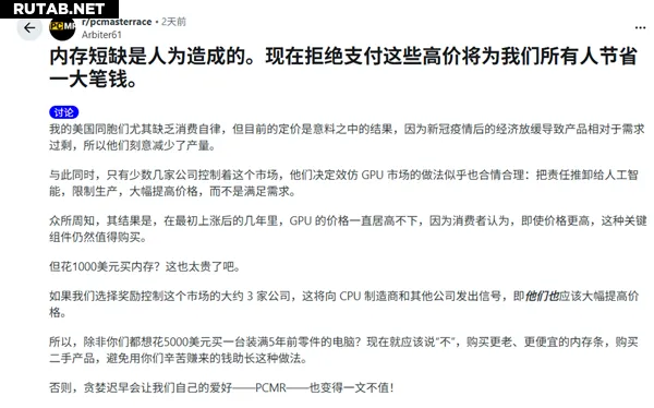 На Reddit появился развернутый пост, в котором пользователь призвал «бойкотировать память», заявив, что «дефицит памяти создан искусственно, и отказ от покупки по завышенным ценам сэкономит всем нам значительные средства».