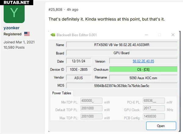 В сети появился слитый BIOS от ASUS для видеокарты RTX 5090 XOC, который теоретически позволяет разблокировать экстремальное энергопотребление до 2000 Вт и повысить напряжение до потенциально опасных 1.15 В.