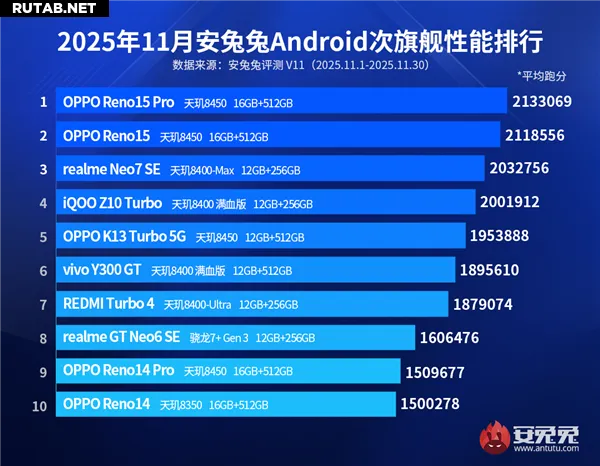 Первые два места заняли OPPO Reno15 Pro и OPPO Reno15, набравшие более 2,11 миллиона баллов. Единственным исключением в первой десятке стал Realme GT Neo6 SE на Snapdragon 7+ Gen 3, занявший восьмую позицию.
