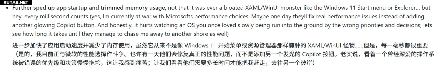 «[Мы] ещё больше ускорили запуск приложения и снизили использование памяти. Оно никогда не было таким раздутым XAML/WinUI-монстром, как меню «Пуск» или проводник в Windows 11... Но каждая миллисекунда имеет значение».
