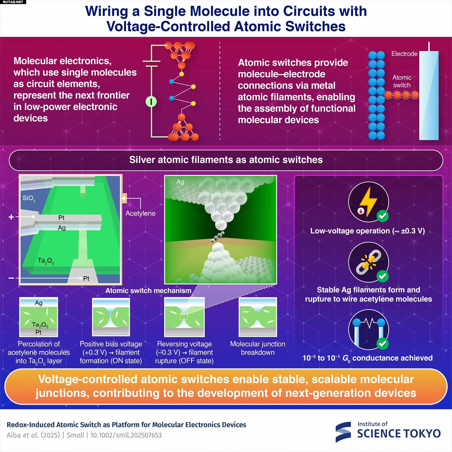 Исследователи из Японии разработали серебряные атомные переключатели, которые создают стабильное электрическое соединение между отдельными молекулами и электродами. Это решает ключевую проблему «проводки» в молекулярной электронике.