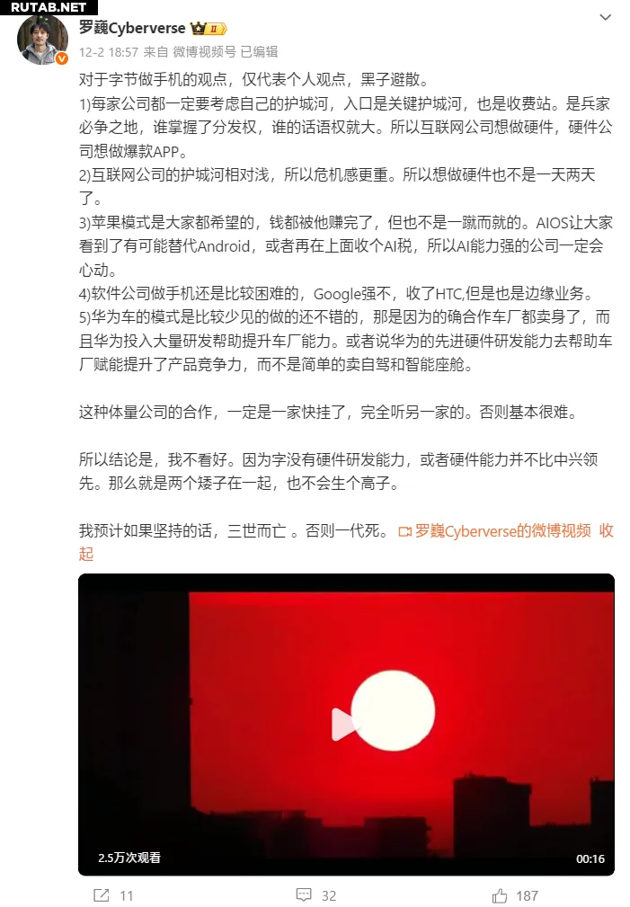 Вывод Ло Вэя таков: «Я не вижу в этом перспектив. Потому что у ByteDance (字 — сокращение от 字节跳动) нет возможностей для аппаратных разработок, или эти возможности не превосходят таковые у ZTE. Так что два карлика вместе не родят великана».