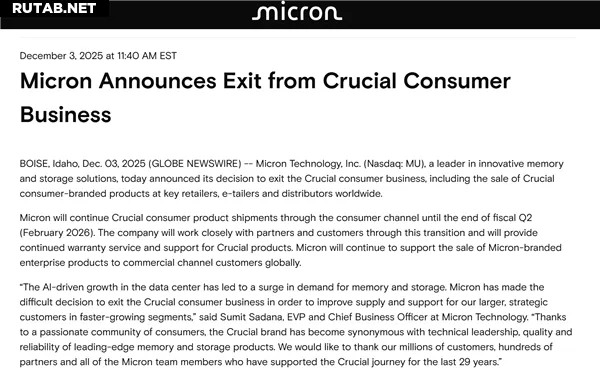 Согласно официальному заявлению, компания прекращает потребительский бизнес под брендом Crucial. Оставшиеся на складах товары будут распроданы до конца второго квартала текущего финансового года (февраль 2026 года). Micron продолжит поставлять корпоративную продукцию под своим основным брендом глобальным партнёрам, а гарантии на уже проданные модули памяти останутся в силе.