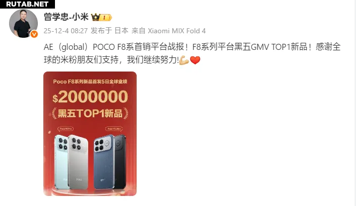 Старший вице-президент группы Xiaomi и глава международного отдела Цзэн Сюэчжун сообщил, что серия смартфонов POCO F8 стала самым продаваемым новым продуктом по общей выручке (GMV) на распродаже Black Friday на глобальном рынке. Продажи модели за первые пять дней достигли 2 миллионов долларов США.