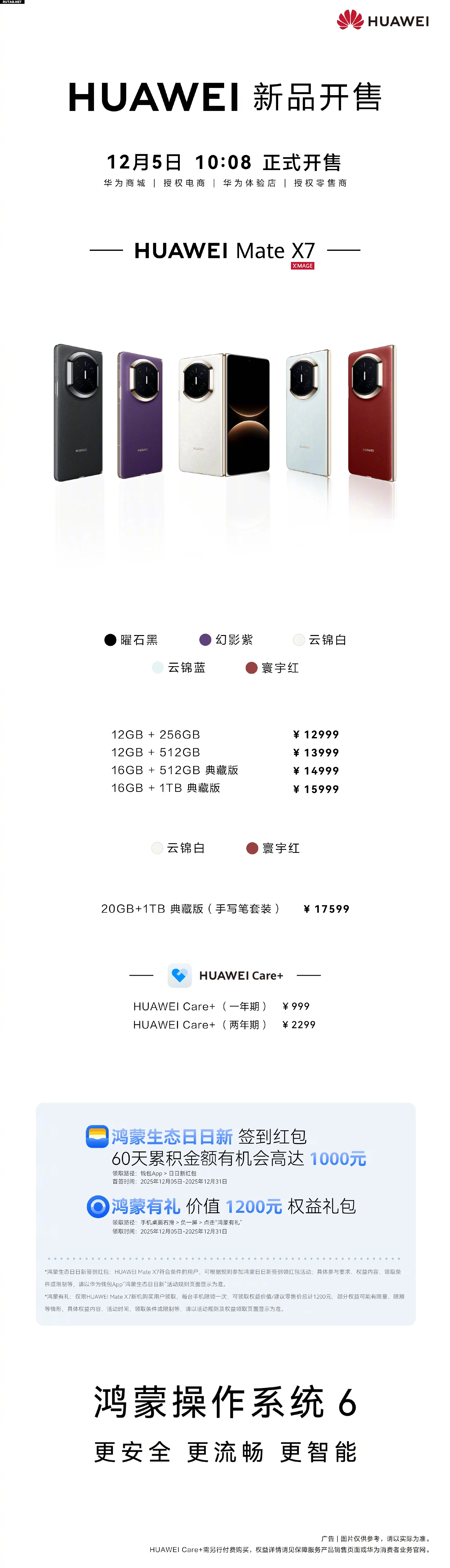 Сегодня, 5 декабря, Huawei официально начала продажи нового поколения своего флагманского складного смартфона Mate X7. Модель, которая традиционно пользуется высоким спросом, поступила в продажу в нескольких комплектациях, начиная с 12999 юаней.