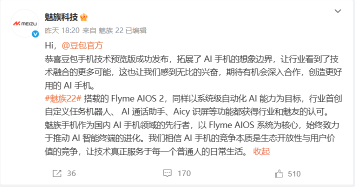 Компания Meizu Technology также выразила поддержку, заявив, что «с нетерпением ждет возможности углубленного сотрудничества». В Meizu считают, что телефон Doubao расширил возможности смартфонов с искусственным интеллектом, и отметили, что их собственная система Flyme AIOS 2 также нацелена на автоматизацию на системном уровне.