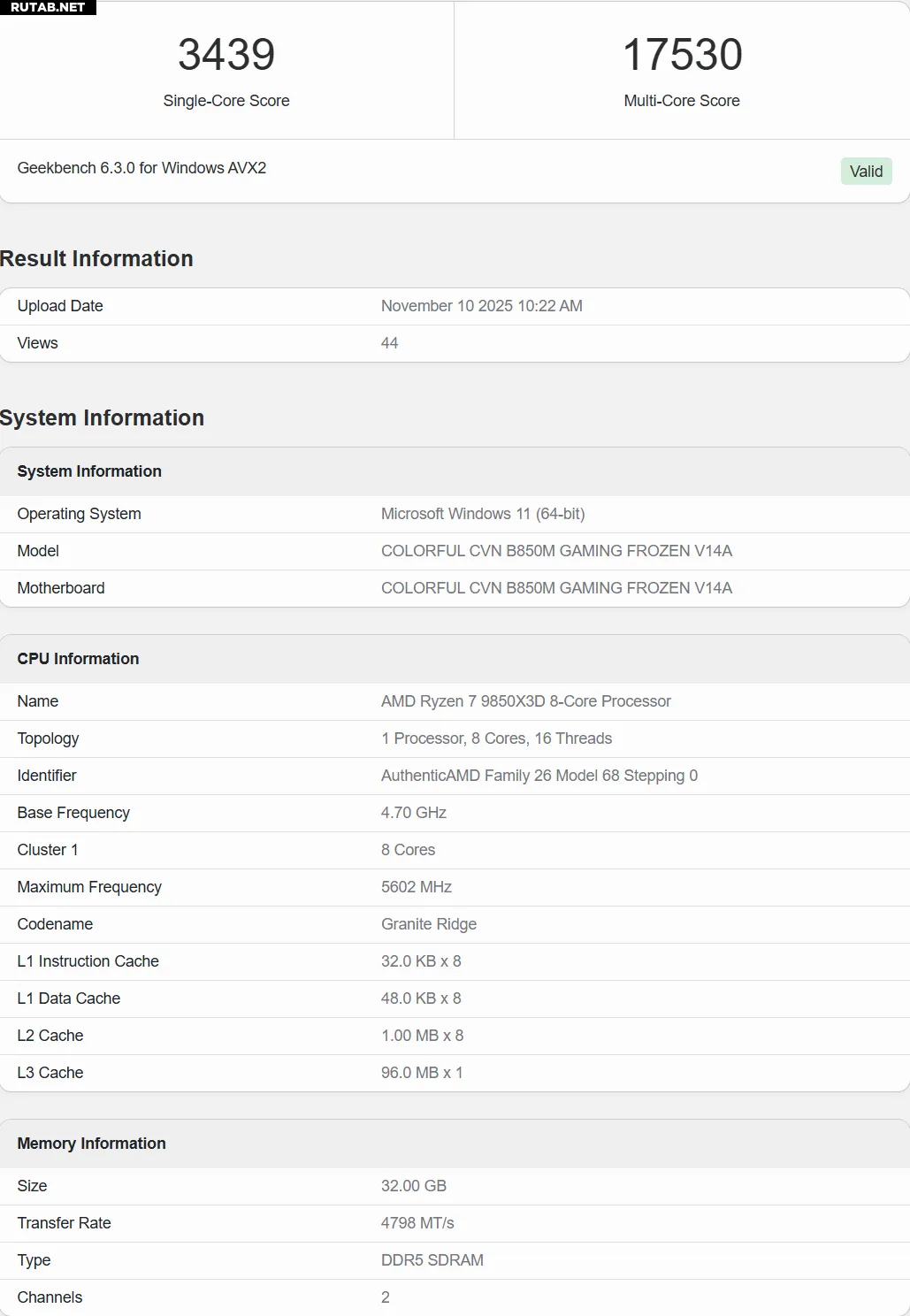 Утечка включает две записи из базы Geekbench 6. В одной из них процессор, установленный на материнскую плату Colorful CVN B850M Gaming Frozen 14A, достигает заявленных 5,6 ГГц. Во втором тесте, на плате Maxsun B850 ITX, частота boost останавливается в районе 5,3–5,4 ГГц. Оба теста проводились с памятью DDR5 4800 MT/s, что могло занизить общий результат. Интересно, что результаты оказались немного слабее, чем у 9800X3D.