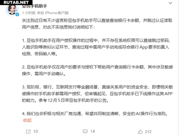 В связи с многочисленными слухами о том, что Doubao Mobile Assistant может напрямую проверять баланс банковских карт и обходить аутентификацию для считывания пользовательских данных, мы заявляем следующее: